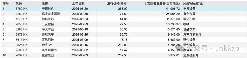 今年以来,港股实际募资规模超过100亿港元的IPO项目达到5个,分别为宁德时代、紫金黄金国际、恒瑞医药、三花智控和海天味业,募资金额分别达到410.06亿港元、249.84亿港元、113.74亿港元、107.36亿港元和105.71亿港元。前五大IPO合计募资986.7亿港元,占年初至今港股IPO募资总额的一半以上。